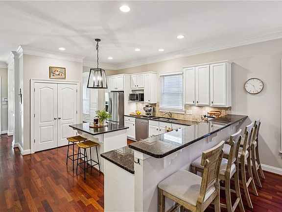 Gas fireplaceDetached two-car garagePrivate rear deckCrown moldingPlay areaLarge islandOpen-concept floor plan