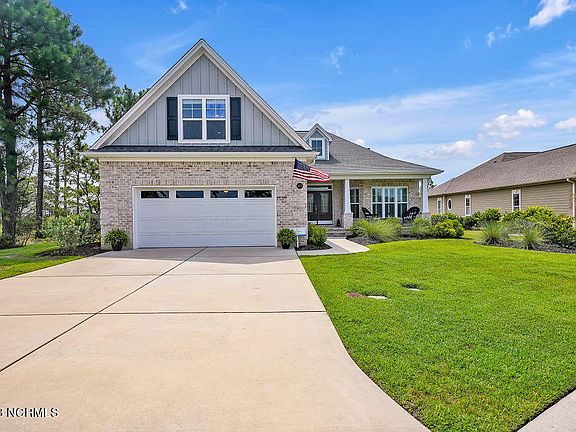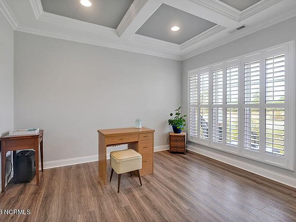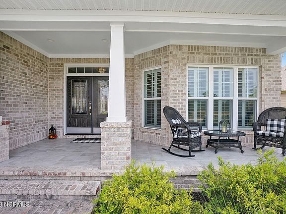 Beautiful 3 bedroom / 3 bath Trusst built home in Hammocks Cove in Compass Pointe. Enjoy pond views and stunning sunsets from the front covered porch, then enter the front of the house into the foyer through an ornate front door finding Luxury Vinyl floors in the foyer and an open format main living room. To the right of the foyer are French glass doors that enter a spacious office/den area. Re-enter the living room area and enjoy the view of the coffered ceiling, built in bookcases, gas log fireplace all while enjoying music on the overhead sound system. Proceed further through the open space living room area then on the left view a culinary kitchen with island with bar seating for 6, with a separate open dining area nearby with trayed ceiling, chandelier, and plantation shutters. Then observe sliders that connect both the dining area and open living room area to an enclosed sunroom. The sunroom faces and opens into the manicured backyard with patio where you experience glorious sunrises. The primary suite, located on the main level, is enhanced with an illuminated trey ceiling, two walk-in closets, and a zero entry fully tiled frameless shower. Also found on the main level is a second bedroom with a double door closet, and a guest bathroom with granite vanity. Upstairs you will find the third bedroom with a full bath and access to abundant attic storage space. Back on the main level follow a hallway from the living area to the laundry room that leads into an oversized 2 car garage with epoxy painted floor and a separate storage area. Enjoy all this in the gated community of Compass Pointe with all its amenities and golf course. Easy drive to Leland/Wilmington shopping and restaurants and local area beaches via nearby 74/76.