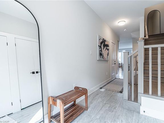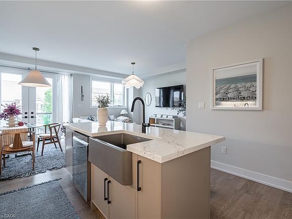 Discover refined living in this beautifully updated 3+1 bedroom townhome, nestled on a quiet street in Burlington’s prestigious Millcroft golf community. Offering a blend of style, comfort, and convenience, this turnkey home is ideal for families and professionals alike. The sun-drenched, open-concept main floor features wide-plank engineered hardwood that flows seamlessly throughout. The designer kitchen is a showstopper, boasting quartz countertops, an impressive 8-ft island with seating, a sleek subway tile backsplash, and premium stainless steel appliances. A dedicated dining area provides the perfect setting for family meals or entertaining guests. Step out to the private backyard, ideal for summer BBQs and quiet relaxation. Upstairs, the spacious primary retreat is a true haven with a large picture window, walk-in closet, and a luxurious 4-piece ensuite complete with quartz vanity, a soaker tub, and a glass shower. Two additional bedrooms share a stylish 4-piece bath, while the second-floor laundry area accommodates full-size side-by-side machines for added convenience. The fully finished lower level adds versatility with a cozy rec room, 3-piece bath, and a true guest bedroom- perfect for visitors, a teen retreat, or home office. Additional highlights include inside garage entry, smart thermostat, rough-in for an EV charger, and low condo road fees covering snow removal and landscaping. Enjoy a premium location just minutes from Millcroft Golf Club, top-rated schools, beautiful parks, shopping, and quick access to HWY 407 & 403. Move-in ready and thoughtfully upgraded, this home is the perfect blend of elegance and function. Welcome to Millcroft living. Some photos have been virtually staged.