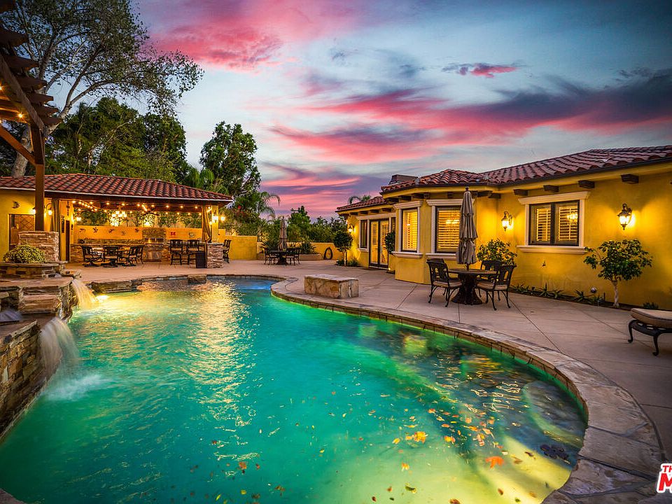 Come celebrate this custom built Mediterranean estate in Chatsworth's Roy Rogers Estates. Built from the ground up in 2010 by the owner builder who was the contractor, and structural engineer for this spectacular cul-de-sac estate. The finest engineering, infrastructure, and craftsmanship far higher than code requirements went into this home for their own family as their forever home. This 6,343 square foot tri-level villa sits on almost half an acre, with 6 huge bedrooms, and 8 bathrooms. Imported marble flooring and hardwood are throughout the home. Entering through opulent custom built dual Metal Estate doors with hinged etched glass inserts, is a breathtaking grand entryway. A bright living room to the left waits as you enter with recessed LED lighting throughout. A 100 gallon water heater with recirculation pump for instant hot water, A security system with remote camera monitoring is included, as well as an audio control system throughout the interior and backyard. An entertainer's dream home with everything you could ask for including; A home theatre with leather recliners, a fitness center (or 6th bedroom), and a 3-car finished garage with crown molding, and vast storage. The Chefs kitchen boasts a Catalina-island sized granite-serving island, butlers serving bar, and walk-in pantry. Viking appliances are throughout; Refrigerator, Oven/Stove, Microwave, Wine refrigerator, Dishwasher, Warming Drawer, and Trash Compactor. The kitchen opens to the family room with a coffered ceiling, and a spectacular regal cocktail wet bar. The master bedroom is the ultimate sanctuary with a sitting area, private balcony deck with views of the Santa Susana Mountains. The master bathroom has dual vanities, his and hers separate walk-in closets, walk-in sauna shower, imported Italian marble tile, large soaking jetted bathtub. The vacation resort yard has a custom salt-water pool, and spa with waterfalls cascading into the pool above the oasis entry for lounging in the water, a glass fire pit area for relaxing, side orchard with mature fruit trees, and the ultimate barbecue center with outdoor living and dining at its finest.Why deal with the 101 freeway when driving into the city when you can take the 118 for the same drive-time, and literally invest half the price for being 5 miles further south. Live the vacation resort lifestyle with the quality of life you deserve, and see yourself celebrating life everyday at 22733 Trigger St.