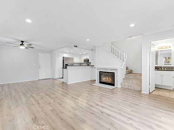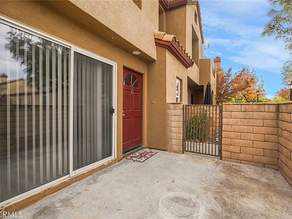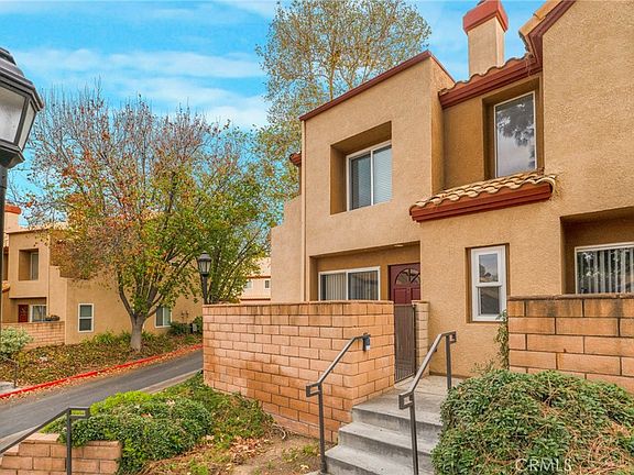 Desirable 3 bed, 2.5 bath, 1,333 sq ft end-unit townhome in gated Seco Villas community of Mountain View Villas tact in Santa Clarita. Step through private, front courtyard and enter into an open floorplan, great-room style main floor. Living room area offers recessed lighting, crown molding, a cozy fireplace, and sliding glass door access to front courtyard. Dining area, conveniently adjacent to the kitchen is demarcated with contemporary chandelier lighting. Clean, modern kitchen has tile flooring, ample storage and quartz counter space, stainless steel appliances, and convenient breakfast bar seating. Additional main floor features include powder bath and direct access to attached 2-car garage with laundry facility. Upstairs area has all new carpeting throughout and offers two good-sized bedrooms with high ceilings, which share a full hall bath. The spacious primary bedroom has high, vaulted ceilings, 3 mirrored closets, and a private, en-suite, ¾ bath. The friendly and welcoming community offers beautifully landscaped common areas, a community pool and spa, with the added security of gated access. Well situated near shopping, dining, entertainment, and recreation. Don’t miss out on the chance to make this your new home!