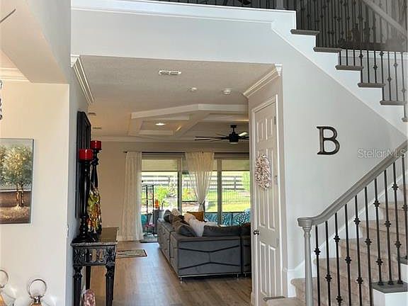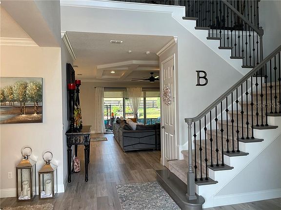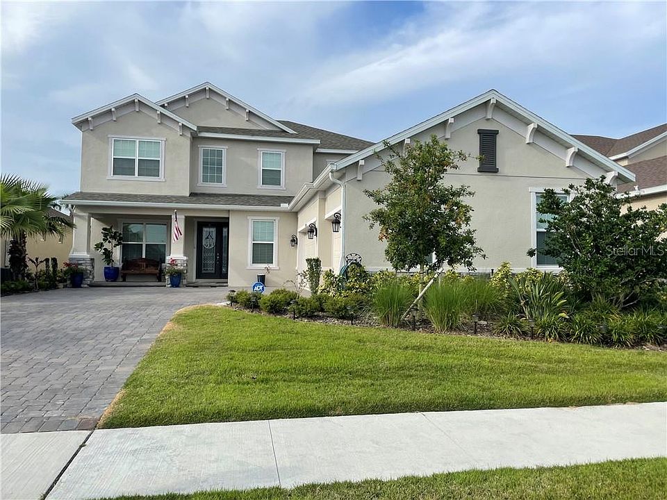 Open plan Sand Key less than a year old Model build by Taylor Morrison Home with 5 bedrooms and 4.5 bathrooms featuring over 4,200 sq ft of living area, offers tons of upgrades added to this beautiful home; Craftsman's 3 car garages with stone exterior elevation, Gutters, Screened in extended lanai runs the entire length of the house, Aluminum fenced yard and lusty landscaping..... This home welcomes you with upgraded 8' Doors and professional molding throughout the entire home, Spacious gourmet kitchen with a walk in pantry, GE series appliances which include a conventional oven and build in microwave. Master bedroom featuring a pocket sliding glass door which can access to Lanai, Motorized vertical blinds installed in living and master bedroom, Iron balusters railing and high quality grade vinyl prank flooring. Community offers amazing amenities; Pool, playground, park and walking trails for the entire family to enjoy!!
