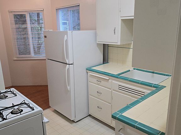Cozy Kitchen: Classic tiled countertops with teal accents, original cabinetry with ample storage, and a charming vintage sink. Equipped with a refrigerator and gas range for functionality.