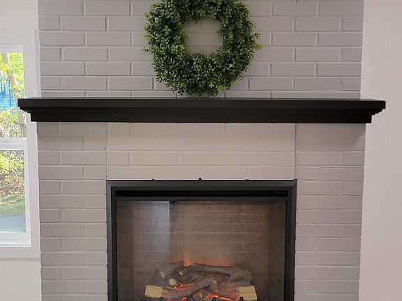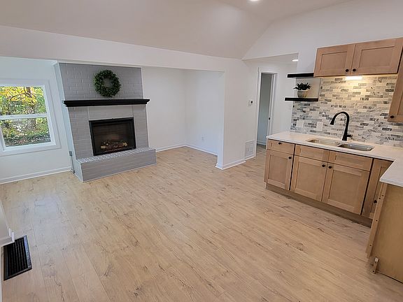 New vinyl sidingQuartz kitchen countertopsNew planked flooringFireplace in the kitchen