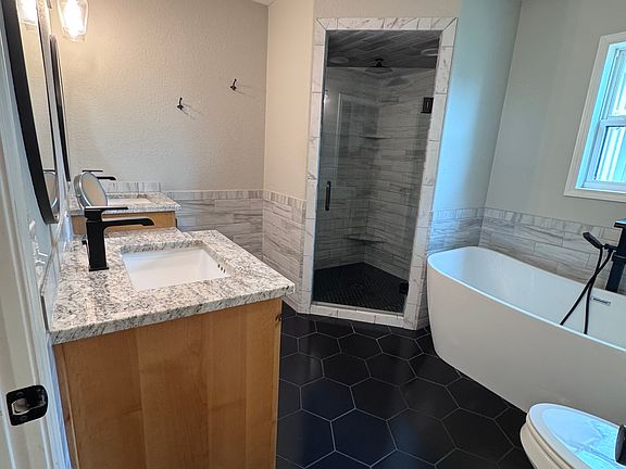 The main bathroom has been completely updated, featuring granite countertops, elegant tilework, a walk-in shower, and a freestanding soaking tub for a touch of luxury.