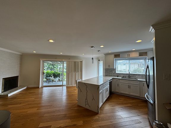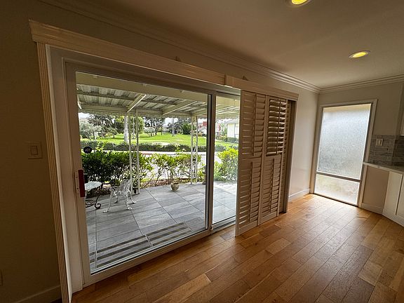 Private patioEngineered wood floorsQuartz countertopsShaker cabinetsOpen-plan kitchenPlantation shutters