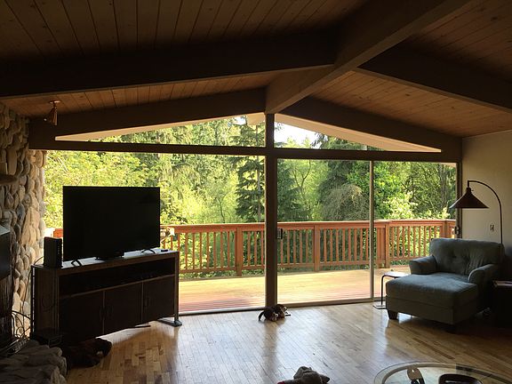 Newly updated mid-century modern home! Featuring an upper lvl w/open main living, master suite, FP, vaulted ceilings w/exposed beams & floor to ceiling windows. Beautiful kitchen w/ss appliances (induction range), pantry & lrg island. Lwr lvl boasts a 2nd kitchen, family rm w/FP, 2 bdrms, 3/4 bath, 2nd utility rm & ample storage. Park-like setting; gated, lrg deck, birds & Dumas Creek on the lwr lvl of the lot. Separate access to lwr lvl of home allows for a MIL spc or potential addtnl income.