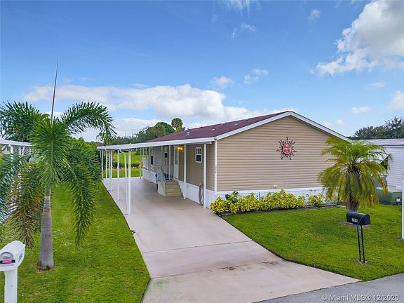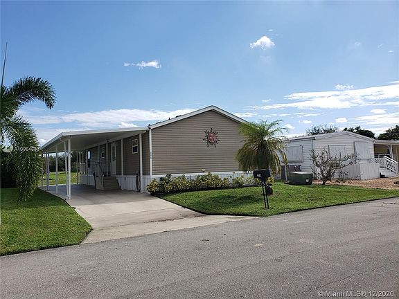 MOVE-IN READY! Very affordable single family, fully furnished modular home and land on the 1st hole of the Davie Golf course. Wake up to lovely views, and nature in your backyard or enjoy coffee or a meal under your shaded back patio. This spacious, well-maintained home is well built, and includes hurricane impact windows and a solid foundation/construction. Vaulted ceilings, modern kitchen, and very spacious rooms inside. Plenty of space for cars under the carport too! An excellent community with 3 pools, clubhouse, and lots of activities. Close to the I-595 and all major highways, shopping, dining, and more! May rent after one year of ownership. Just perfect if you wish to move to Florida and want more value for your money!