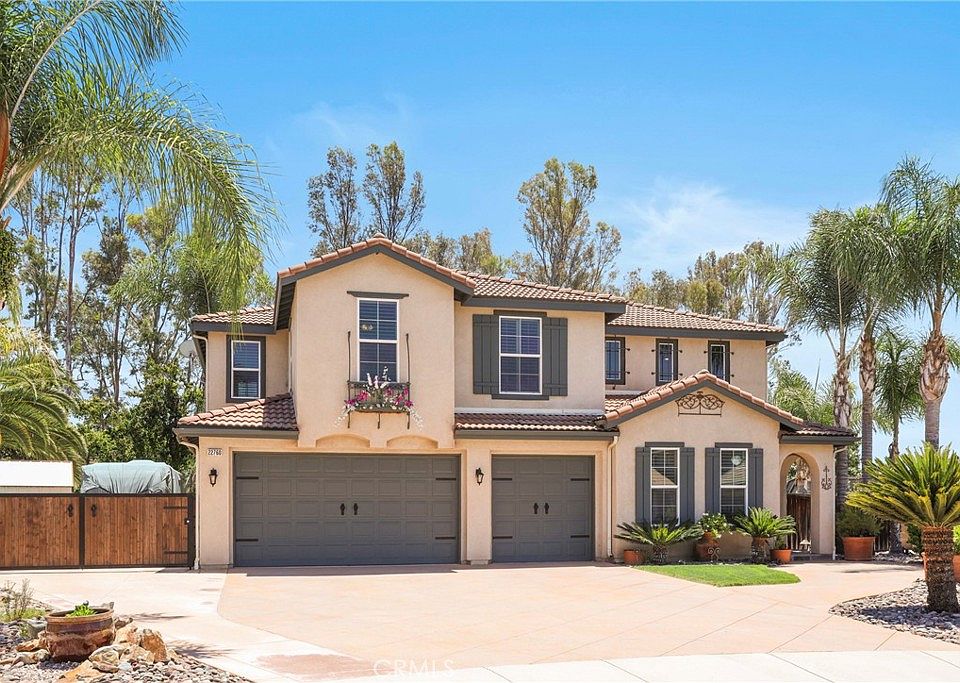 Welcome to this stunning former model home located at the end of a quiet cul-de-sac on nearly half an acre—one of the largest lots in the neighborhood. This spacious 5-bedroom, 3-bathroom home includes a convenient downstairs bedroom and full bath, ideal for multi-generational living or overnight guests. Spacious and bright with soaring cathedral ceilings in the living and great rooms, creating an open and airy feel, while custom wood accent walls and designer paint add a warm, stylish touch throughout the home. The entertainer’s kitchen features granite countertops, stainless steel appliances, upgraded cabinetry, a large center island with breakfast bar, and a walk-in pantry, all seamlessly connected to the great room, which includes custom stonework and rough hewn wood mantle at the fireplace, a media niche for the TV and whole house audio system. Adjacent to the kitchen is a built-in coffee nook and next to the great room is a built in wine bar. Window coverings include wood blinds, some plantation shutters, and electric blinds for convenience. Upstairs, the expansive primary suite offers a private tiled deck overlooking the backyard with west-facing views towards the Santa Rosa plateau, a jetted spa tub, separate shower, dual vanities, and a generous walk-in closet. Three additional bedrooms and another full bathroom upstairs provide plenty of space for family and guests. Great features such as tile flooring downstairs and in the entry, plush carpet upstairs, dual A/C units for zoned climate control, recessed lighting and more. This property also includes a 220V outlet and insulated doors in the garage, a reverse osmosis water filtration system at the kitchen sink, and a low-volume sprinkler system for efficient irrigation. The expansive backyard is a private oasis featuring a covered patio, barbecue area, garden shed on a concrete pad, and dozens of mature palms—including sego, queen, and canary island varieties. Backs to a beautifully wooded Riparian Zone that's a peaceful buffer between neighbors. Gated RV parking and storage shed adjacent to the garage. Energy-efficient solar panels help keep electric bills low, and with property taxes close to 1.1%, this home offers exceptional value. Fantastic south Wildomar location that's close to some great restaurants, Baron's Market and other shopping, easy access to the freeway, close to schools, medical facilities and just a short drive to Murrieta and Temecula.