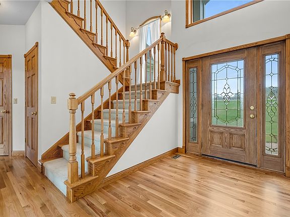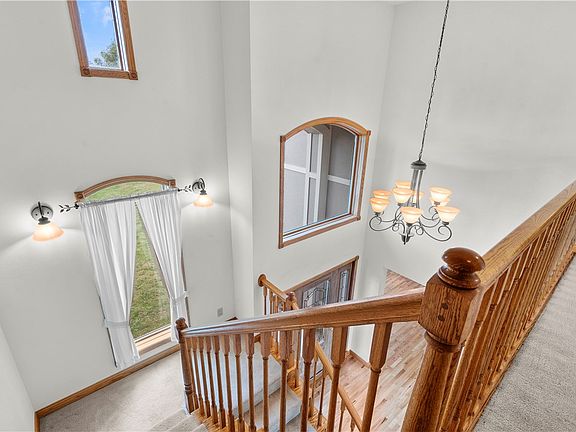 PELLA ACREAGE! Enjoy the tranquility of country living with the convenience of Pella just minutes away. This 1.5 story home sits on nearly 2 acres with trees encompassing 3 sides of the property, located in the sought-after Wildwood Development. Almost 3,000 square feet of finish above grade plus finished basement features 3 bedrooms (plus 2 additional non-conforming bedrooms), 4 bathrooms, living room/entryway open to 2nd story with large Pella windows for natural light, gas fireplace, formal dining or office/flex space. Kitchen features granite countertops, oak cabinetry, and dining area. Convenient and spacious main floor laundry/dropzone and 1/2 bath. All appliances stay including washer/dryer. Main level includes Primary ensuite with large windows overlooking the tree-lined backyard, massive walk-in closet, soaking/jet tub, encapsulated shower, water closet & large double-sink vanity. Upstairs are 2 bedrooms, full bath with double sink vanity, finished bonus room that can be used as a 3rd non-conforming bedroom, or office space. Walkout lower level includes a great room, wetbar w/fridge staying, 3/4 bathroom and 2 bonus rooms that could potentially be used as office space, media room, workout room, or non-conforming bedrooms. Bonus is the oversized tuck under garage which can be used for storing yard equipment, workspace or storage. This home is a must see to appreciate all the amenities it has to offer!