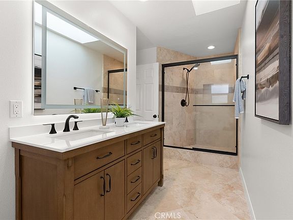 Beautiful, fully remodeled home nestled in the highly sought after Costa Mesa Bluffs! 2 bedrooms 2.5 baths, with 1 bed and bath on the first floor. Numerous upgrades include stunning kitchen featuring maple soft-closing cabinetry, custom tile backsplash, granite countertops, recessed lighting, with all new appliances. Travertine entrance and bathrooms flooring, upstairs has real wood flooring, while the bedrooms have new carpet, the property has high ceilings with a beautiful spiral staircase with large skylight with a WOW factor! the two private master suites with two remodeled sparkling bathrooms feature custom vanities and granite/quarts countertops, travertine showers, master has a backlit mirror with all matte black hardware to add a modern touch. Laundry room is located upstairs inside the half bath. Enjoy cool ocean breezes year-round from the private deck. An oversized 2-car attached garage that includes two garage doors, with direct access, perfect to house your cars AND your bikes complete this gorgeous home. Numerous trails for walking and biking and embracing the outdoor lifestyle! Situated above the Talbert Nature Preserve and bordering Huntington Beach, this hidden gem is a short walk to the Bluffs, Vista Park and just over a mile to the beach. Don’t wait. This one won’t last long!