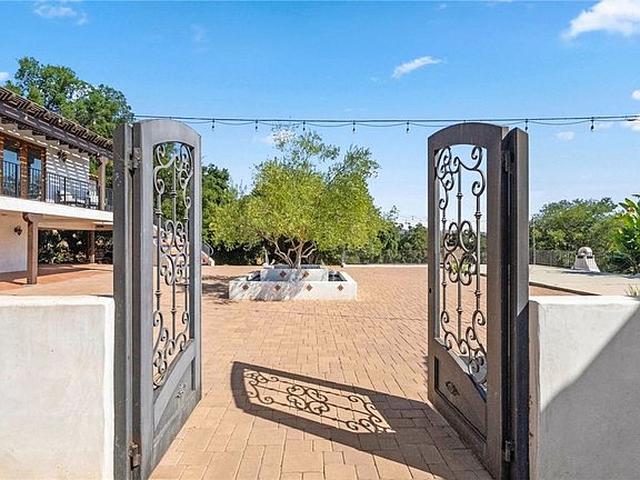 Ancient rare Engleman Oaks showcase the property with its' history and beauty. A seasonal creek weaves its way through the trees with gorgeously crafted bridges placed about. The property boasts towering oak trees, three varieties of grapevines, apple, lemon, orange, grapefruit, persimmon, peach, plum and avocado trees. The outdoor area is a true paradise, featuring Spanish tile, a mineral infinity pool, hot tub, outdoor fireplace, market lights, and modern amenities creating an unforgettable setting. Adjacent to the pool is a private 475 sq. ft. wine cellar. Overlooking the pool and grounds is a spacious patio with a majestic fountain featuring an olive tree at its center—perfect for entertaining. Two outdoor half baths provide added convenience for guests. Private entry gate leads you to a detached oversize three car garage that is opposite a shady covered parking area.