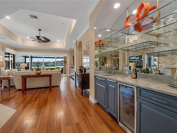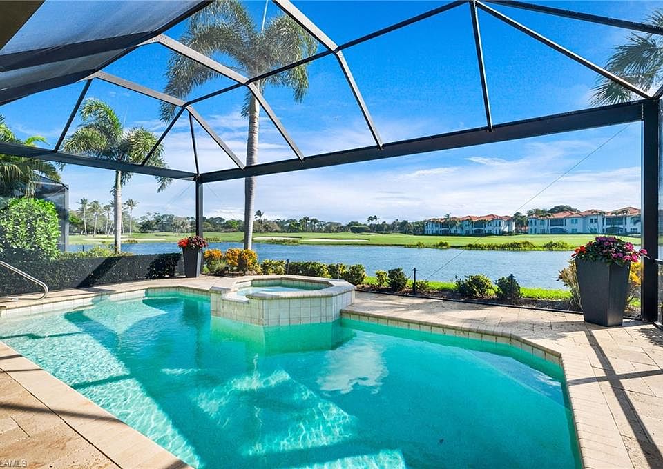 From the moment you enter this beautiful residence, you will be enthralled by the sweeping lake and golf course views of 8th Fairway on the Palm Course. This home is perfect for entertaining, with an updated kitchen and bar…and dining al fresco can be a daily occurrence. With spectacular views through picture window screens, why go to a restaurant for dinner? The travertine lanai was extended for extra space, so throw on some steaks and shrimp on the grill, relax poolside with your favorite beverage, and be entertained by pelicans, herons, and egrets swooping by. Neutral tile floors with added wood floors in the family room, a spacious kitchen, and a wet bar complete with a beverage refrigerator and ice maker, make the perfect home! New roof in 2021, impact windows, 2-car garage with epoxy flooring. This neighborhood offers close proximity to Club amenities, including a 30,000 sq. ft. Wellness Center, Pool Café, the Pointe Grill, resort pool, two Clubhouses, three golf courses, new pickleball center, bocce, tennis, and a myriad of social opportunities. Situated in the heart of Naples, Grey Oaks is just minutes away from the beach, downtown, shopping, and restaurants. Welcome home!