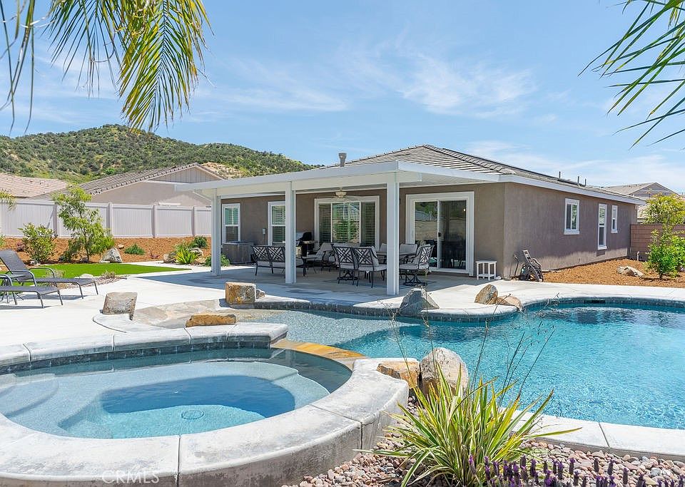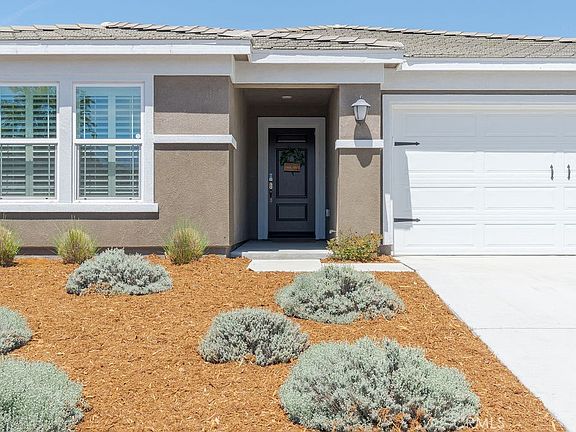 Welcome to Summerhill, an all single level KB community. This charming RV Ready Lot, single level homes sits on just over a 10,000 sqft lot with a stunning POOL/SPA. Newly constructed in 2020 this home offers fantastic curb appeal, upon entering you are greeted by LVP flooring that flows beautifully throughout the home (only the 3 bedrooms have carpet) each window is dressed with plantation shutters. This is a split style floorplan with 2 bedrooms that share a hallway bath on the left side and the primary suite on the right side. The kitchen and living room are very open in a great room style concept featuring quartz counters, white shaker cabinets and a full backsplash laid in a herringbone pattern, custom pendant lighting over the island, stainless appliances and a large walk-in pantry. The living room also features a cozy fireplace. The primary suite offers a private en-suite bath with separate tub/shower, dual sinks and large walk -in closet. Let's talk pools.... offering a designer pool w/beach entry and pebble tech, just intime for summer. The alumna wood patio cover adds ample shade and a great place to sit poolside. The side yards on BOTH sides are oversize and the HOA does allow for RV parking on the driveway side. Professionally landscaped backyard with artificial turf, drip system, fruit trees, accent boulders and freshly barked planters, this yard is ready to go for summer entertaining. This community is conveniently located close to freeway access, shopping and dining. A true gem!!