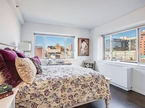 Welcome home to the unusually spacious 4A at the Bridge Condominium in East Harlem. This corner unit 1,300sf 2BR/2Bath condominium boasts an expansive living room spanning 24 feet, perfect for entertaining. Sunlight abounds through triple northern/western/southern unobstructed exposures, highlighted by the apartment's newly refinished dark oak wood floors. The windowed kitchen opens directly onto the separate dining alcove and sports granite countertops, opaque glass and oak cabinetry, and stainless steel appliances by GE Profile. Sleeping chambers are discretely situated to the north, with a luxurious master bedroom suite with ample room for separate vanity table, desk or sitting area. Windowed master bathroom features a glass shower stall and both bathrooms are lined with marble and ceramic. A separate windowed laundry room is conveniently located just off the foyer and includes additional closet space.