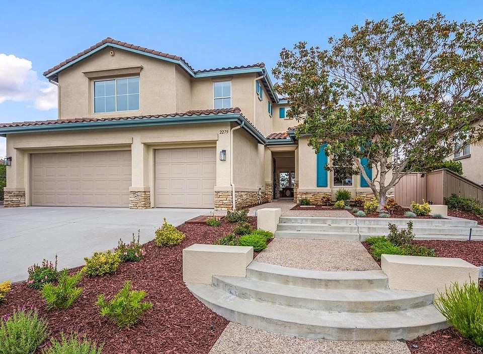 **VA Loan Assumable at 2.25%, until 2051, for the loan amount: $573,605.** Assumable to anyone. Incredible, private corner lot in La Costa Valley, with beautifully updated floors, kitchen, baths, and new HVAC. This property features 4 bedrooms with an office or optional 5th bedroom, and 3.5 baths, including private guest quarters with a bedroom and full en-suite bath on the first floor. This ideal floor plan opens to the bright and open living and dining rooms, with large windows overlooking the very private and pristine backyard, and continues through to the open concept kitchen and family room. The kitchen features all new quartz countertops and new appliances, and a center island with breakfast bar seating. The family room with a cozy fireplace connects seamlessly to the kitchen and nook, and on to the covered backyard patio and open grassy area. The first floor includes a conveniently located powder room and an extra-large laundry room with ample cabinets and storage space. The second floor features a primary suite with a beautifully remodeled bath, including dual vanities and additional seated vanity with all new quartz countertops, newly tiled soaking tub, newly tiled walk-in shower with glass doors, and newly carpeted walk-in closets. The primary suite also features a large balcony, and separate office that can be converted to a 5th bedroom. Two additional large bedrooms and a full bath with dual vanities and newly tiled shower complete the second floor. The spacious backyard has a lovely covered patio, built-in bbq, grassy turf area, and new landscaping. The corner location, paired with the HOA-maintained open space behind the house, offers ultimate privacy within the beautifully planned and centrally located community of La Costa Valley. The low $135 HOA fee includes access to the staffed Valley Club, Junior Olympic-sized newly renovated pool and spa heated year-round, fitness center, clubhouse with commercial grade kitchen, tennis courts, RV lot, tot lots, basketball court, and walking trails and parks throughout. Located in the San Dieguito school district, and minutes to top restaurants, shops, entertainment, beaches, golf, and much more!
