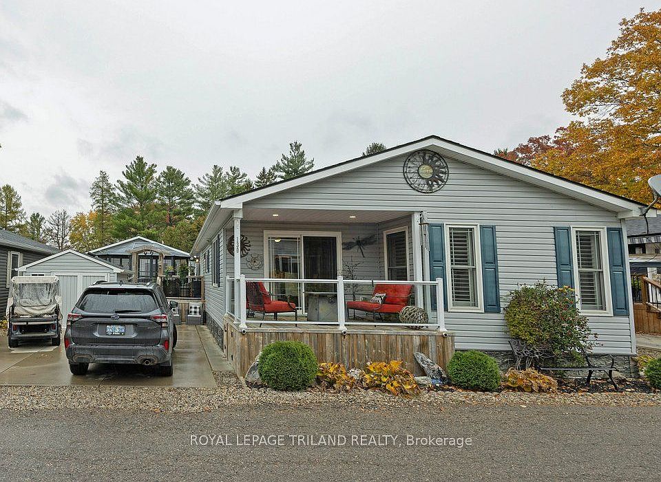 Welcome to unit #130 - this has to be one of the best units in the park! Original owners bought this unit in 2017. Foyer is spacious and bright with laminate wood flooring. Kitchen was just renno in 2024 and it is a dream space to work in. It's a mixture of white with black accents (farm sink). White subway tile backsplash and quartz countertops. Under cabinet lighting. Island. Appliances 2024. Eating area has patio doors leading to covered porch with propane fire table (included). Spacious great room has propane fireplace and lots of windows for natural light. Laundry has tons of storage. Dryer is propane. Primary is oversized with king bed and lots of built in furniture (included). Walk through closet and three piece en-suite with built ins. Second bedroom is awesome use of space with Murphy bed (included) that becomes a desk when not in use. Lots of room for a reading room or office when not entertaining guests. Main bath 4 piece with quartz countertop and backsplash (2024). The best part is the extra large deck (approx 400 square feet) with 3 season gazebo that is approx 12 ft x 17 ft. Adds so much space to unit and great to watch the game or a cozy summer movie. Electric fireplace and TV included on gazebo. Golf cart included. Propane BBQ included. Shed. Storage under the house. Double driveway.