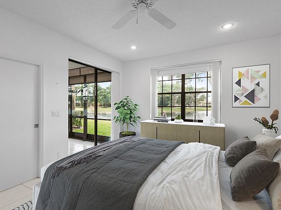 Enjoy lake views from this spacious 3BR/2BA 1st-floor corner unit with a private garage in Boca Pointe. Located west of I-95--no flood zone, no assessments, and not impacted by new condo laws. This home offers rare privacy with no shared walls on three sides and only one neighbor above. Features include a bright split floor plan, granite kitchen, formal dining, tile floors, laundry room, and enclosed patio overlooking the water. The primary suite boasts dual closets and a large ensuite bath. Set in a quiet 2-story building with access to the community pool. Boca Pointe membership not required. Prime location near everything!