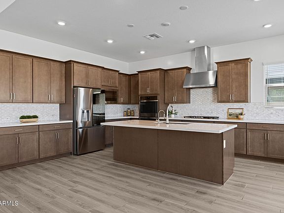 At the heart of the home is an executive kitchen featuring a massive island, gas cooktop, stainless steel appliances, sleek quartz counters, and plenty of storage. The refrigerator, washer, and dryer are all included, adding convenience from day one. The spacious primary suite serves as a private retreat with a spa-like bath that includes a soaking tub, glass-enclosed shower, dual sinks, and a walk-in closet. Two additional bedrooms and a den provide flexible space for crafts, guests, or a home office.