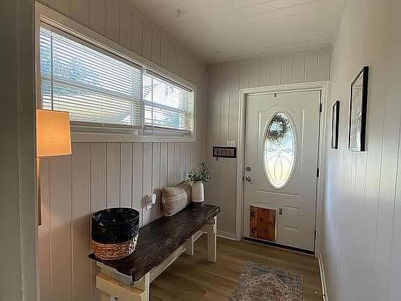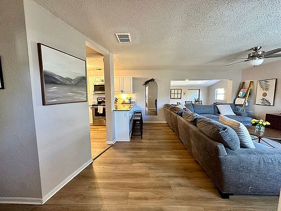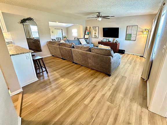 The expansive front yard, combined with its prime corner location, ensures ample space from neighbors and lends a welcome sense of privacy. Inside, the home offers more than 1,700 square feet of comfortable living space. Modern luxury vinyl plank flooring extends throughout the living areas, while the bathrooms have been updated with tiled showers. The kitchen features updated stainless steel appliances, granite countertops, and new light fixtures. The home's multiple entries provide the flexibility to create a private mother-in-law suite or primary retreat.