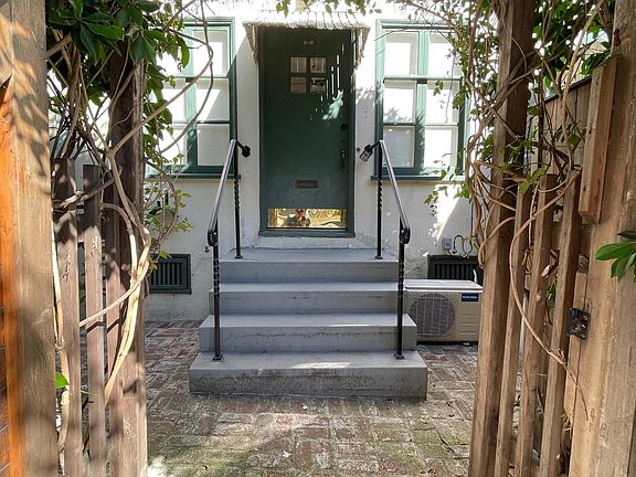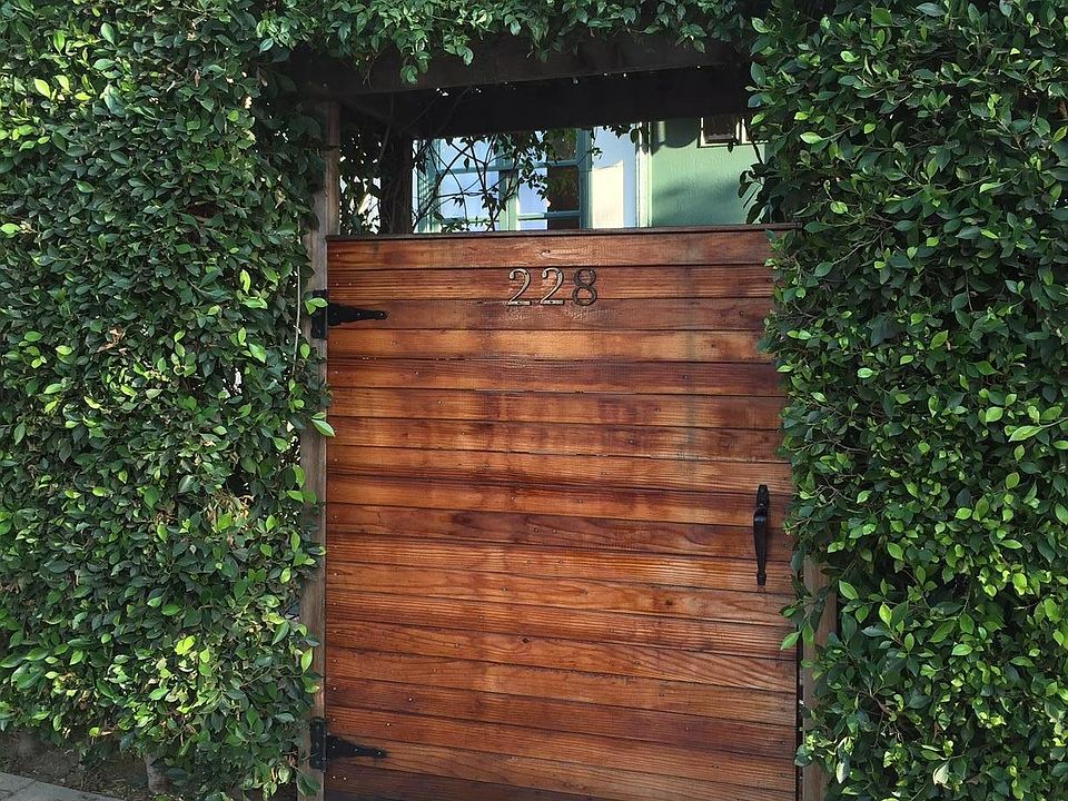 This is a 1-bedroom-1-bath 1920s historic townhouse with a gated front entrance near downtown Los Angeles. It's on the first floor, with a privacy hedge and small front landing. The second floor is rented separately with its own entrance.