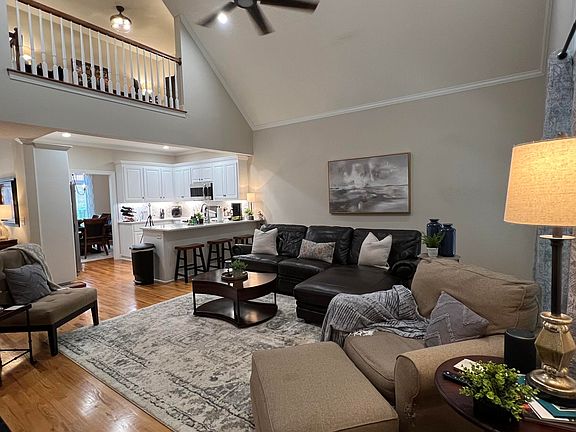 The Villas at Barrington Hall: This gorgeous, move-in-ready 3 Bedroom, 2 1/2 bath Townhome has over 2,200 sq ft of living space and is located on a quiet cul-de-sac in Barrington Hall Subdivision. The main living area features an open floor plan with 20-foot-high vaulted ceilings, solid wood floors, and a gas fireplace. The primary bedroom is on the main floor and there is a large loft on the second floor that overlooks the Livingroom. The loft is a perfect for a home office or play area for the kids. The kitchen has been upgraded to a Gallery Series convection oven, refrigerator and microwave oven. There are quartz countertops and a custom Herringbone Polished Marble backsplash. This home also has an amazing amount of extra storage. The backyard has been fenced in and the rear balcony overlooks a beautiful, wooded area with a creek. The rear balcony has also been upgraded with a maintenance-free roof that provides plenty of shade and is a great place to relax.