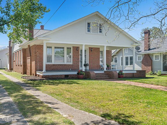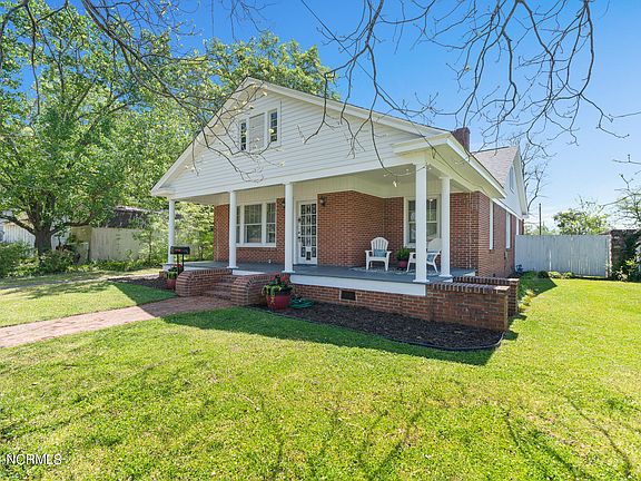 Charming 3-bedroom 2.5-bathroom home in Rockingham! Full of character, this home features original hardwood floors, 9-foot-tall ceilings, intricate trim work, built-in bookcases, two living areas, and three bedrooms that each have their own individual bathroom. Recent updates include granite countertops, stainless steel appliances, waterproof flooring in kitchen and den, exterior trim and siding, front porch remodel, and a rebuilt back deck. Large detached garage/workshop provides plenty of space for storage, toys, tools, and games. This home sits in a convenient location, steps away from downtown Rockingham and popular Hitchcock Creek.