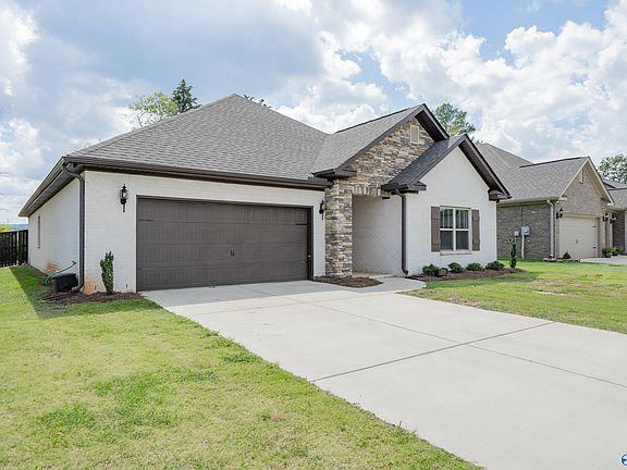 Privacy fence and blinds included! This 3 bed, 2 bath full-brick ranch offers open living with a cozy fireplace, granite kitchen with island seating, and stainless appliances. The spacious primary suite features dual vanities, soaking tub, and tiled shower. Enjoy a covered patio overlooking the fenced backyard with peaceful views. Built in 2022, this home includes LVP flooring, two-car garage, and convenient access to shopping, dining, less than 15 minutes from Downtown Huntsville and Interstate 565.