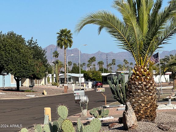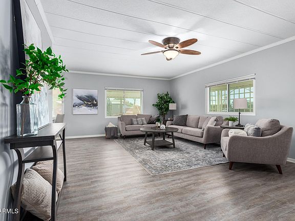 OWN THE LAND! Check out this 2B2B home in the 55+ community of Mesa East, in Mesa, AZ. This home is neat as a pin! Inside you'll find clean and modern neutral tones plus updated wood-tone flooring. The kitchen is light and bright plus the dining area has built-ins for organized storage. New A/C and windows keep this home cool! Outside you'll love the views of the Superstition Mountains plus and RV gate/pad and extra storage. Mesa East is a popular and affordable resort-style community with pool, library, shuffleboard, bingo, dancing, cards, and more!