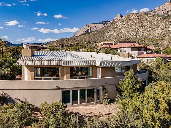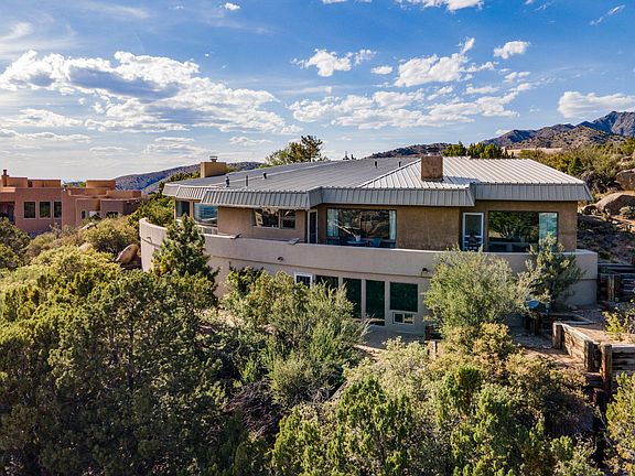 Nestled in desirable Sandia Heights, this charming residential gem boasts impressive high ceilings and large full length windows that invite an abundance of natural light, creating a warm and inviting atmosphere. Imagine entertaining friends in the spacious living and dining areas, all while soaking in the breathtaking city and mountain views. Two expansive seperated bedrooms, including one featuring a convenient small kitchen unit with seperate entrance offers versatile living options. Enjoy leisurely evenings by the fireplaces or unwind in the luxurious jet tub in the master suite. Several adobe wall accents add charm. This home blends comfort with style, making it an ideal sanctuary in a vibrant community. Enjoy the abundant bird life. Workshop space in the garage.