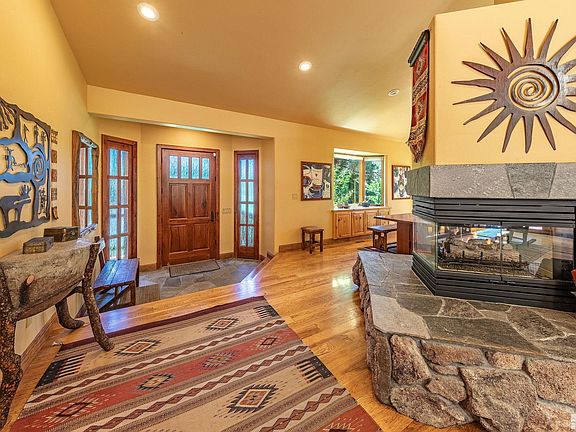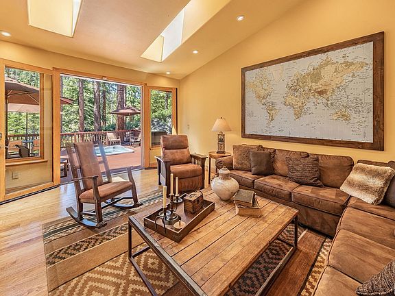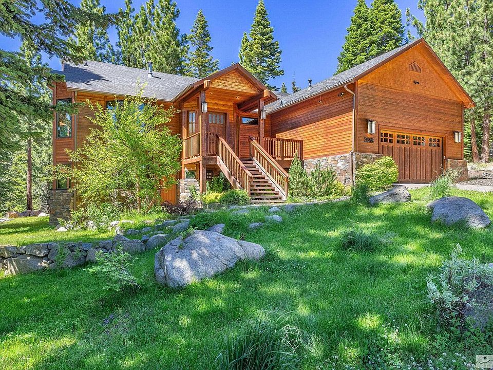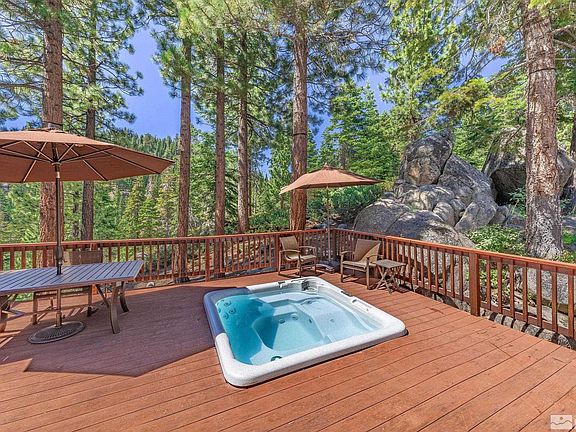 This exquisite property, set on the Nevada side of Lake Tahoe, offers an unparalleled blend of serene forest and majestic mountain vistas. The home is versatile, featuring two separate units that can be independently secured. The upper level has vaulted ceilings and expansive windows, allowing sunlight to flood the interior. During summer, a cool breeze flows through the open doors and windows. This level includes a fully equipped kitchen, a spacious living room, a dining area, a primary suite..., ...two additional bedrooms, and a full bathroom. The deck, accessible from both the living space and primary suite, features a built-in hot tub surrounded by beautiful granite boulders and offers breathtaking views over miles of USFS land. The lower level provides an additional living space, a kitchen, two bedrooms, and a bathroom. The home offers direct access to the Castle Rock Trail and Tahoe Rim Trail via railroad tie steps. Nearby, the beloved Stinger Trail caters to avid mountain bikers, and a short drive leads to world-class skiing at Boulder and Stagecoach lodges at Heavenly. This property is an outdoor enthusiast's dream. Located on a school bus route, it benefits from regular snow plowing and is just a few miles from all of South Shore's amenities. Additional quality features that make this home so special are the excellent sound system throughout, beautiful hickory hardwood floors, plenty of storage and a ski locker. Being offered with the well-appointed furnishings. This rare opportunity allows you to enjoy secluded tranquility without sacrificing modern conveniences.