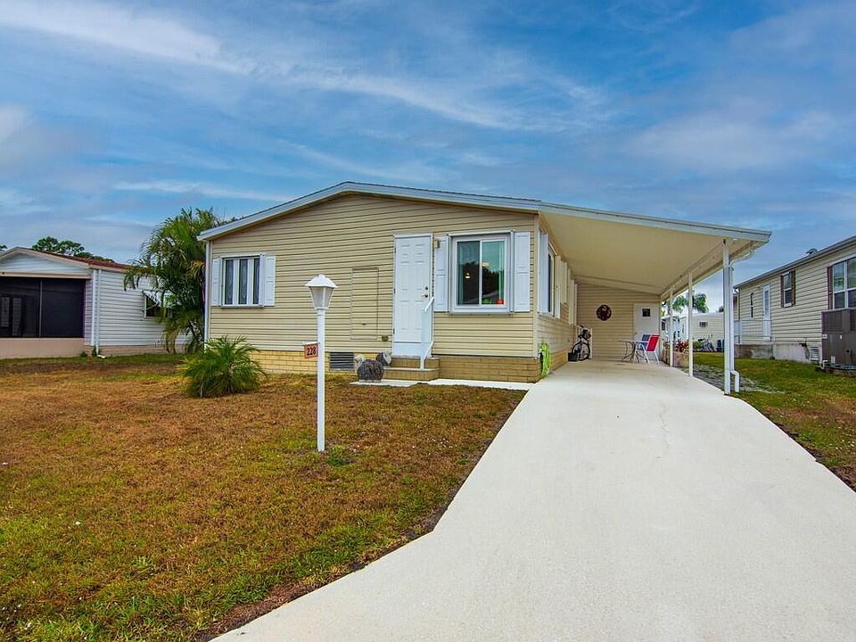 This beautiful 3-bedroom 2 bath mobile home is now available for sale. Located in a Lovely, peaceful community. This home features a spacious and bright living room area, vast kitchen, large bedrooms, newer roof, Screened patio, accordion shutters, and new energy efficient windows. The central location of this home allows for easy access to nearby beaches, and shopping to ensure that all of your daily needs are met just a short distance away. Enjoy the convenience of a low land lease, making it an affordable option.