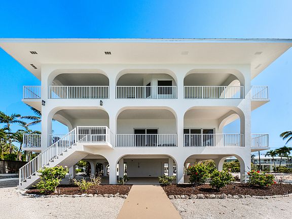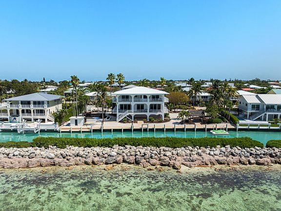 Nestled on the ocean, this exceptional estate on Plantation Island in Duck Key presents an extraordinary opportunity to own a piece of paradise. Located on an expansive double lot, the property offers a rare chance to create a custom oceanfront compound with ultimate privacy. With 162 feet of concrete seawall and protected dockage for multiple vessels, it's an ideal setting for boating enthusiasts and those seeking an unparalleled waterfront lifestyle. Designed with timeless elegance, the residence features solid concrete construction, newly installed impact windows and doors, and sweeping ocean views from nearly every room. The freshly painted exterior blends seamlessly with the natural surroundings, while the coastal-inspired interior offers relaxed yet refined living. This home provides the perfect canvas to elevate your vision of luxury living in the Florida Keys. Upon entering, you are greeted by a breathtaking open-concept living space, where walls of glass invite abundant natural light. A striking coral rock accent wall, a hallmark of Florida Keys beauty, creates a sophisticated focal point in the living room. The seamless flow between the living, dining, and kitchen areas fosters an inviting space for entertaining and relaxing. The gourmet kitchen, equipped with top-of-the-line appliances, is both a culinary haven and a place to gather, while the crushed shell travertine floors add an organic touch throughout the home. The residence includes four ensuite bedrooms upstairs, two of which offer direct ocean views, and an additional full bathroom on the main living level. Notable exterior features include a built-in jacuzzi with a wraparound deck, a concrete bait house, and a tiki hut. The expansive double lot offers unlimited potential for future development. With ample space for expansion, you can design a resort-style pool, private pickleball court, putting green, or additional structures to suit your lifestyle for creating a one-of-a-kind oceanfront estate.