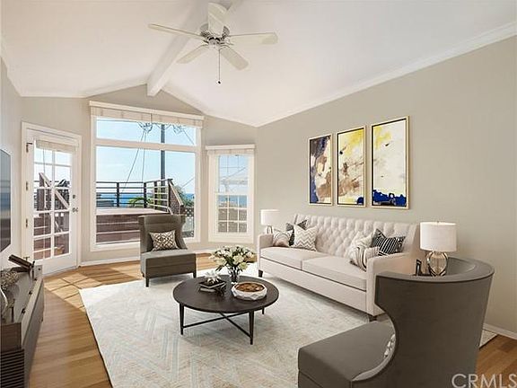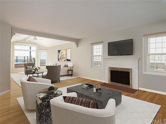 California Coastal Cottage with jaw dropping ocean views!  This two bedroom, one and a half bath home is filled with character, natural light, and gorgeous original hardwood floors.  The formal dining room has chair rail and crown molding and is conveniently located next to the charming kitchen complete with white cabinetry, stainless steel appliances, custom tile backsplash and generous sized laundry room.  The living/family room is enormous and perfect for entertaining or just sitting and enjoying the sunsets and ocean views with a beautiful fireplace, vaulted ceilings, skylights, picture windows, and access out to spacious deck which highlights the incredible ocean views and breezes.  The sun lit primary suite has stunning windows, a private French door entrance from deck, stylish light fixture and en suite half bath with chic Carrera marble topped vanity.  There is a second bedroom and full bathroom with awesome skylight, soaking tub, stall shower, wainscoting and white vanity.  The ocean views are outstanding from the massive backyard deck and below is a terraced yard that would be the perfect spot for your garden.  Additional features of this home include attached one car garage and original solid wood doors throughout.  The location of this home is perfectly situated atop a hill to showcase all of its breathtaking ocean views.