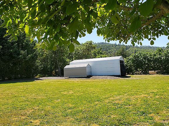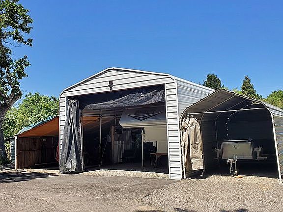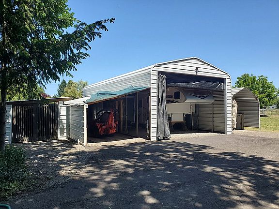 Absolutely gorgeous 1.5 acres gated year-around creek-front irrigated property. Long private tree-lined drive leads you to a perfectly-maintained yard, huge shop, 4+ car garage, wood shop, 20 x 44 RV parking, dog kennel, enclosed woodshed, garden area, lots of mature trees including apples, plums, apricots, walnut & grapes. Backs to orchard land. Don't let the age of the home put you off-this home has been beautifully maintained w/new vinyl low-e windows thru-out, updated kitchen, big living room w/Blaze King wood stove. Covered patio, above-ground pool. Deck overlooking the creek. Also a mini-one-room cabin overlooking creek~ Property this side of trees is open irrigated pasture