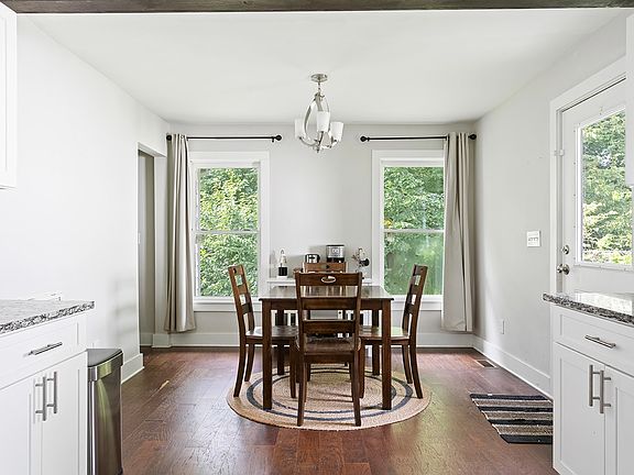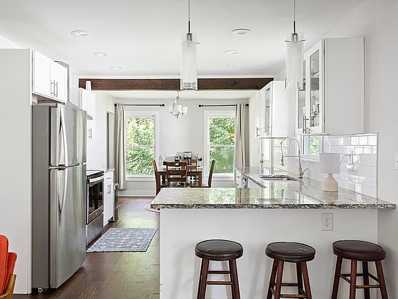 Rich hardwood floorsGorgeous colorsSubway tile backsplashWhite shaker style cabinetsGranite countersMasterfully updatedOpen kitchen