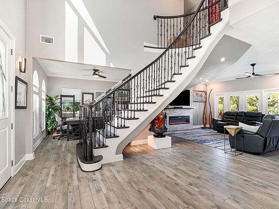 Welcome to your private tropical retreat in this beautifully remodeled 2-story pool home, nestled within a secure gated community. Step inside to an impressive 20' entryway with soaring ceilings and a custom winding staircase that sets the tone for elegance throughout. The open floorplan features wood-look tile flooring, impact windows and doors (plus hurricane shutters), & a whole-house generator for peace of mind. The gourmet kitchen and spacious living areas flow seamlessly to the outdoor oasis; complete with lush landscaping, paver entertainment space, and a sparkling pool with a swim-out, all perfectly positioned to capture refreshing river breezes. With 4 bedrooms and 3 full bathrooms, the Primary Suite offers a private deck overlooking the scenic Sykes Creek, Newfound Harbor, and Wildlife Refuge. Sold fully furnished. Enjoy breathtaking sunsets and tranquil mornings surrounded by nature, with the convenience of a community dock right next door ~ coastal living at its finest!