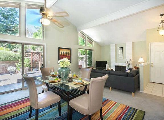 This spacious One-level, End Unit, 2 bed 2 bath Townhouse is peacefully located on a quiet, tree-lined community within Cupertino's most desired, gated neighborhoods! De Anza Oaks. Open Floorplan w/ soaring vaulted ceilings. Updated kitchen and bathrooms, electric stove. Remodeled master bath with stall shower. Forced heat & AC, dual paned windows. Oversized back yard perfect for entertaining. Top Cupertino schools: Stevens Creek Elementary, Kennedy Middle and Monta Vista High. The neighborhood offers an amazing environment with lovely mature landscaping, junior Olympic size pool, community clubhouse, children's playground and expansive green areas and walking paths.