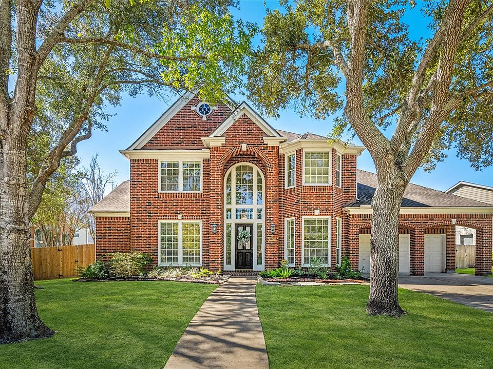 Welcome to this picturesque brick two-story home nestled under a canopy of mature trees with amazing curb appeal! Fantastic floorplan features TWO bedrooms down + additional three bedrooms upstairs (new carpet 10/25). Formal living/study + formal dining + gameroom up. Fabulous living area with soaring ceilings + windows allowing for abundant natural lighting. Fantastic storage. Enjoy entertaining in your private backyard pool + spa with plenty of additional green space. Easy access to Grand Parkway, LaCenterra, shopping + dining!