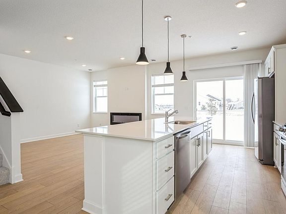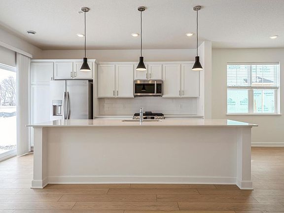 Up on the main floor, your family room, central kitchen with an island, and dining room all come together