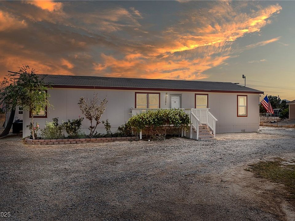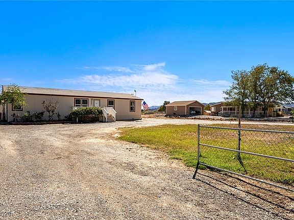 No HOA, converted-to-real-property manufactured home on a fully fenced 1 acre near the Shadow Mountains in NW Pahrump. Features a bright living room and separate family room in a split floor plan. Front and back decks for seamless indoor-outdoor living. Two large sheds (one workshop) and a circular driveway. Ample room to expand the backyard and create a mini homestead or desert retreat. Move-in ready and well-maintained. Don’t miss this charming home. Schedule a tour.