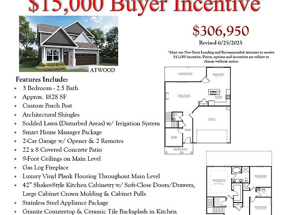 $15,000 Buyer Incentive Offered with Recommended Lender. New Atwood Plan Under Construction on One of the Final Lots in Hampshire Heights. 3 Bedroom - 2.5 Bath, Approx. 1828 SF. Architectural Shingles - Sodded Lawn (Disturbed Areas) w/ Irrigation System - Smart Home Manager Package - 2-Car Garage w/ Opener & 2 Remotes - 22 x 8 Covered Concrete Patio - Gas Log Fireplace - Luxury Vinyl Plank Flooring Throughout Main Level - 9-Foot Ceilings on Main Level. Kitchen Features: 42" Shaker-Style Cabinetry w/ Soft-Close Doors/Drawers, Large Cabinet Crown Molding & Cabinet Pulls. Stainless Steel Appliance Package, Granite Countertop & Ceramic Tile Backsplash. Granite Vanities in All Full Baths - Trey Ceiling in Master Bedroom - Double Sinks, Garden Tub & Separate Shower in Master Bath. 1+8 Builder Warranty Included.