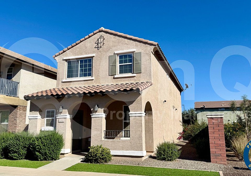 Available Now! This contemporary two-story home in Gilbert, Arizona, offers 1,390 square feet of thoughtfully designed living space with four bedrooms and four bathrooms, providing ample room for family living or entertaining guests. The open-concept living area seamlessly connects the kitchen and living room, where large windows flood the space with natural light, creating a bright and airy atmosphere. The kitchen is a chef's dream, featuring dark wood cabinetry, sleek stainless steel appliances, and elegant granite countertops. The primary bedroom spans 220 square feet and serves as a private retreat, while all bedrooms feature ceiling fans for added comfort. Bathrooms are modern and well-appointed, including one with a glass-enclosed shower and generous vanity space. Additional amenities include a separate laundry room with top-loading appliances, tile flooring in common areas, and a neutral color palette that allows for personalized decor. The attached garage provides convenient parking, and the backyard offers a comfortable space for outdoor relaxation. Located within a vibrant community with a pool, playground, and walking paths, and near top-rated schools, shopping, and dining, this home perfectly balances style, comfort, and practicality for modern living.