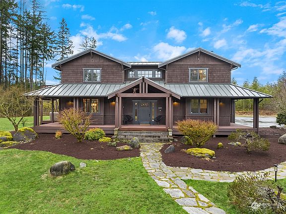 Completely immerse yourself in nature on this 5-acre hidden retreat. Open and level pasture with modern living spaces make this a true NW Farmhouse. Custom build boasts elegant architectural design, fir trim throughout, and abundant large windows and skylights. Epicurean kitchen with Wolf gas range provides ample prep space to create gourmet meals. Dine and gather in the great room, the hub of house, and bask in the sunset glow as you observe the elk roaming in the pasture. Head upstairs to your expansive primary suite complete with soaking tub, walk-in closet and private deck. Coveted 4 bed up floorplan, covered outdoor deck, mud room with dog wash, sport court, workshop, RV parking and so much more - this sanctuary is calling your name!