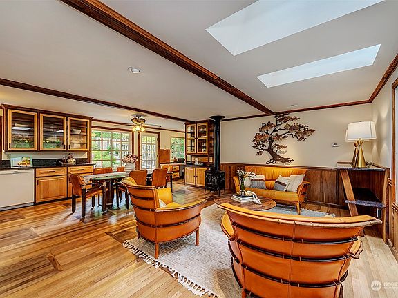 Masterfully crafted and beautifully maintained, this 3-bedroom Bothell home sits on a large, lush lot with easy access to 405 and 522, major employers, and acclaimed Northshore schools. Featuring a lodge-like great room with custom oak & walnut inlay flooring, premium built-ins and woodwork, the home exudes warmth and quality. All three bedrooms have high-end porcelain tile floors and rich landscape views. Fully fenced backyard with berry bushes, fruit trees, blooming native plants, vegetable garden, goldfish pond, an expansive lawn and entertainment sized patio. Heated and insulated garage with abundant storage, custom arched RV canopy with 30 AMP service hookup, and a small cabin that can be an office. This home is truly special!