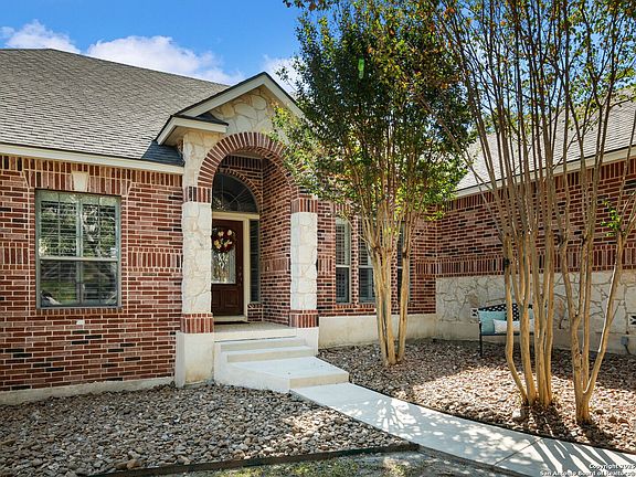 Great style with timeless personality in Steeple Brook. Experience the allure of this stunning one-story home on a serene .52-acre wooded lot within a gated community. This 4-bedroom, 3-bathroom residence combines classic elegance with modern amenities. Enjoy the cozy family room and spacious living room plus a private study/office. The huge living room adds additional living space for entertainment and at the heart of this home is a beautiful kitchen which flows seamlessly into the warm and inviting family room with fireplace. This culinary arena provides natural stone counters, custom backsplash, and an expansive breakfast bar. A formal dining room completes the package. A luxe owner's suite offers a tray ceiling and additional sitting area overlooking the pool. The primary bath includes dual walk-in closets, a spa tub and oversized walk-in shower. Three nicely sized secondary bedrooms and two full baths add to this one-story allure. The home boasts a three-car garage and fantastic backyard that features an enclosed patio space 10X10 plus a sprawling level deck and refreshing sparkling pool. The expansive backyard presents endless opportunities for outdoor living. Ideally situated between Boerne and San Antonio, with easy access to IH10 and local amenities.