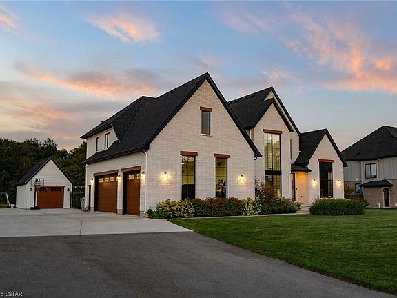 This exquisite custom built home checks all the boxes! Nestled in the tranquil outskirts of London, this meticulously designed home boasts unparalleled craftsmanship and attention to detail. Situated on just under an acre of land, you'll relish the peacefulness and privacy that the outskirts offer. Spanning across two levels, this residence features 5 spacious bedrooms, providing ample room for the entire family and guests. An additional flex room in the basement can be used as a home office, gym, or a spare bedroom. The main level is a masterpiece in itself, housing the master bedroom complete with a lavish 5-piece ensuite bathroom including heated flooring and a spacious walk-in closet. This level also unveils an expansive open-concept living area, seamlessly integrating a kitchen with a large quartz island complemented by a stunning backsplash. A butler's pantry, equipped with a custom wine rack and fridge is sure to impress. Discover the fully finished basement, accessible directly from the garage, including a gym, full bar area complete with an island hosting a dishwasher and bar fridge, ample storage, an additional bedroom and a 3-piece bathroom. The heart of this home lies in its dream backyard oasis. A vaulted covered porch welcomes you, inviting you to enjoy your morning coffee while being mesmerized by the breathtaking sunsets. This backyard includes a saltwater pool, a large composite deck spanning the length of the home and a versatile workshop.