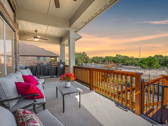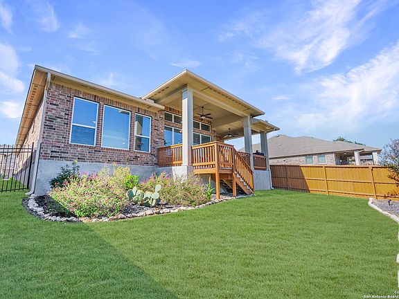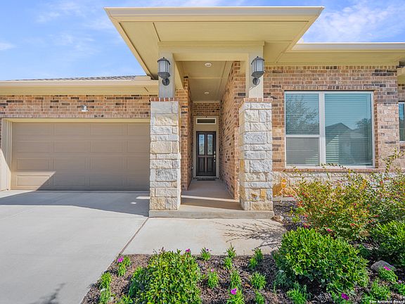 This better than new, David Weekley custom home is located in prestigious Campanas at Cibolo Canyons, offering unprecedented amenities, a resort lifestyle and easy access to coveted TPC San Antonio. With 3 bedrooms and 2 full baths in 2,335 square feet on one level, this home boasts an open floor plan with a layout that lives large, great for entertainers and chefs alike. The kitchen is the centerpiece with plentiful white cabinets, and a huge island that could easily be a second dining area. There are two pantries, gas cooking, granite counters, gorgeous custom tile backsplash and wood-look tile floors. There is an open office that can be used as a flex space or game room in addition to the spacious dining room with built-ins and buffet serving station with more granite counters. The master bedroom retreat is your sanctuary. It's spacious with abundant natural light and a spa-like on suite bath with a walk-in super shower, dual vanities, and the closet of your dreams that connects directly to the laundry room. Enjoy evenings on the large covered porch, or head to one of 3 different pools, meet friends at the clubhouse, take a walk on the nature trails throughout the community, or play some tennis or pickleball. There is nothing to do but move in. Yard work for the front and back yard is done by the HOA. This also includes front yard mulch and flowers planted twice a year. Security monitoring is even included as well. Dont' miss the full flight of stairs to a huge storage area above the 2-car garage, making downsizing that much easier.