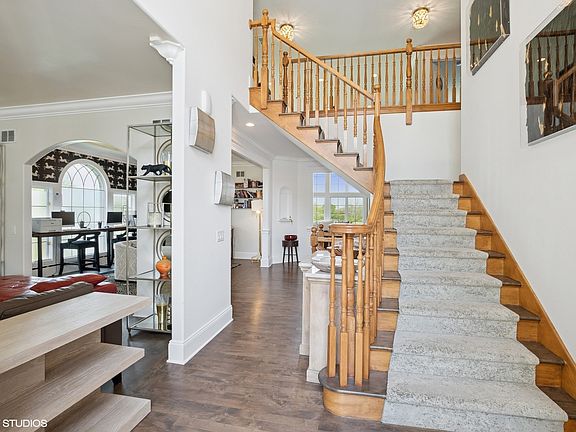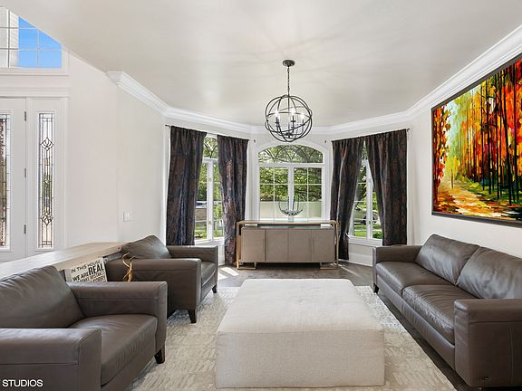 Welcome to Lakeview Estates - A Refined Retreat in the Heart of Frankfort. Nestled in the prestigious and highly sought-after Lakeview Estates, this extraordinary custom-built residence is the perfect blend of timeless elegance, modern luxury, and thoughtful design. Showcasing tranquil pond views, an expansive finished walkout basement, and over 6,600 square feet of finely curated living space, this home offers a rare combination of sophistication, comfort, and versatility for today's lifestyle. The home's curb appeal is second to none, highlighted by professional landscaping, a maintenance free Azek deck, a 5-car heated garage with finished drywall and cabinetry, and a convenient garage-style shed. A concrete driveway and lush green surroundings set the tone for the exceptional interior that awaits. Step inside through a grand two-story foyer bathed in natural light, where rich hardwood flooring flows throughout the main living areas. The formal living room welcomes you with a bayed sitting area and transom windows, creating a serene space for morning coffee or quiet evenings. Nearby, the formal dining room features a tray ceiling and crown molding, offering a sophisticated setting for entertaining. The private executive office, enclosed with French doors, provides a quiet and elegant space ideal for working from home. At the heart of the home is the fully renovated gourmet kitchen, designed for both functionality and visual appeal. Custom white maple cabinetry, quartz countertops, marble backsplash, a large island with breakfast bar, walk-in pantry, and custom buffet provide ample space and storage, while high-end stainless-steel appliances elevate the experience. The kitchen flows seamlessly into the dramatic two-story great room, where a stunning wall of windows showcases scenic pond views and floods the space with natural light. Upstairs, you'll find four generously sized bedrooms, each with its own walk-in closet. The primary suite is a private retreat, complete with hardwood floors, elegant ceiling panel molding, and a spa-like ensuite bath featuring quartz vanities, a luxurious multi-head shower with body sprays, porcelain and marble tile, and a relaxing whirlpool tub. This suite also includes a soundproof laundry room and a custom California Closet walk-in system, combining comfort and convenience. The second bedroom is an ensuite with a private bath and walk-in closet, while the additional bedrooms are connected by a stylish Jack and Jill bathroom with updated finishes. The walkout basement offers incredible flexibility and space for entertaining, related living, or guest accommodations. It includes a family room, rec room, game room, bedroom, full bath, and direct access to the backyard. Designer ceiling treatments, custom wallpaper, and curated finishes elevate the lower level with the same attention to detail found throughout the home. With over $250,000+ in recent updates, including newer lighting, flooring, bathrooms, and mechanical improvements, this home is move-in ready and has been impeccably maintained. A full list of improvements is available upon request. Ideally situated near Commissioners Park, the Frankfort Splash Pad, award-winning schools, and Downtown Frankfort's shops and dining, this home delivers on every level-location, lifestyle, and luxury. This is more than a home; it's a statement of quality and thoughtful living.