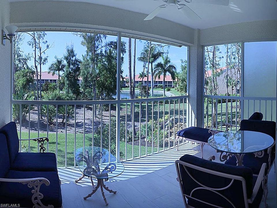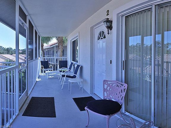 Spectacular second floor end unit offers two large screened in lanais. Enjoy the sunset and tropical view from your back lanai This three bedroom two bath room very nicely furnished condo is in move in condition. Brand new tile floors throughout the whole condo. Only steps to the 10,000 sqft tropical saltwater heated pool. Close to Naples down town fine dining and shopping. Only minutes to Naples beautiful beaches.
